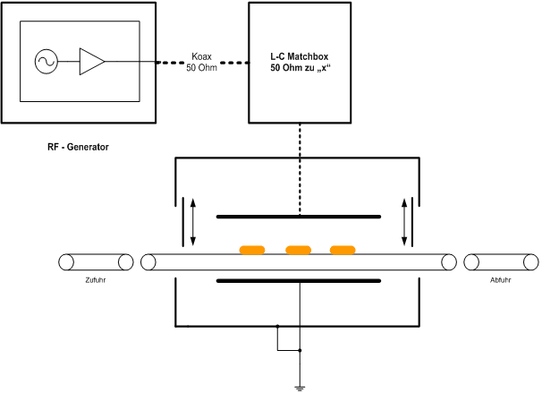 | Die schematische Darstellung zeigt den RF-Leistungsgenerator als Energiequelle. Er stellt eine quarzstabilisierte hochfrequente Wechselspannung bereit, die über eine Matchbox auf die Elektroden (auch als Applikatoren bezeichnet) eines Plattenkondensators geführt wird. Die Matchbox realisiert die für eine effiziente Einkopplung erforderliche Impdanzanpassung, so das die Leistungsstufe auch bei variabler Gutmenge und Feuchte (das variable Dielektrikum des Kondensators) an einem konstanten Arbeitspunkt bei 50Ohm Lastimpendanz betrieben werden kann. Die eigentliche Erwärmung des Produkts findet zwischen den beiden Elektroden. Die Elektroden selbst bleiben kalt. Ein Gutfördersystem transportiert das Produkt durch die geschirmt ausgeführten Erwärmungsanlage. Nicht dargestellt sind ergänzende Mess-, Steuer- und Regelungseinrichtungen für die Erzielung einer konstanten Produktqualität. | ||
